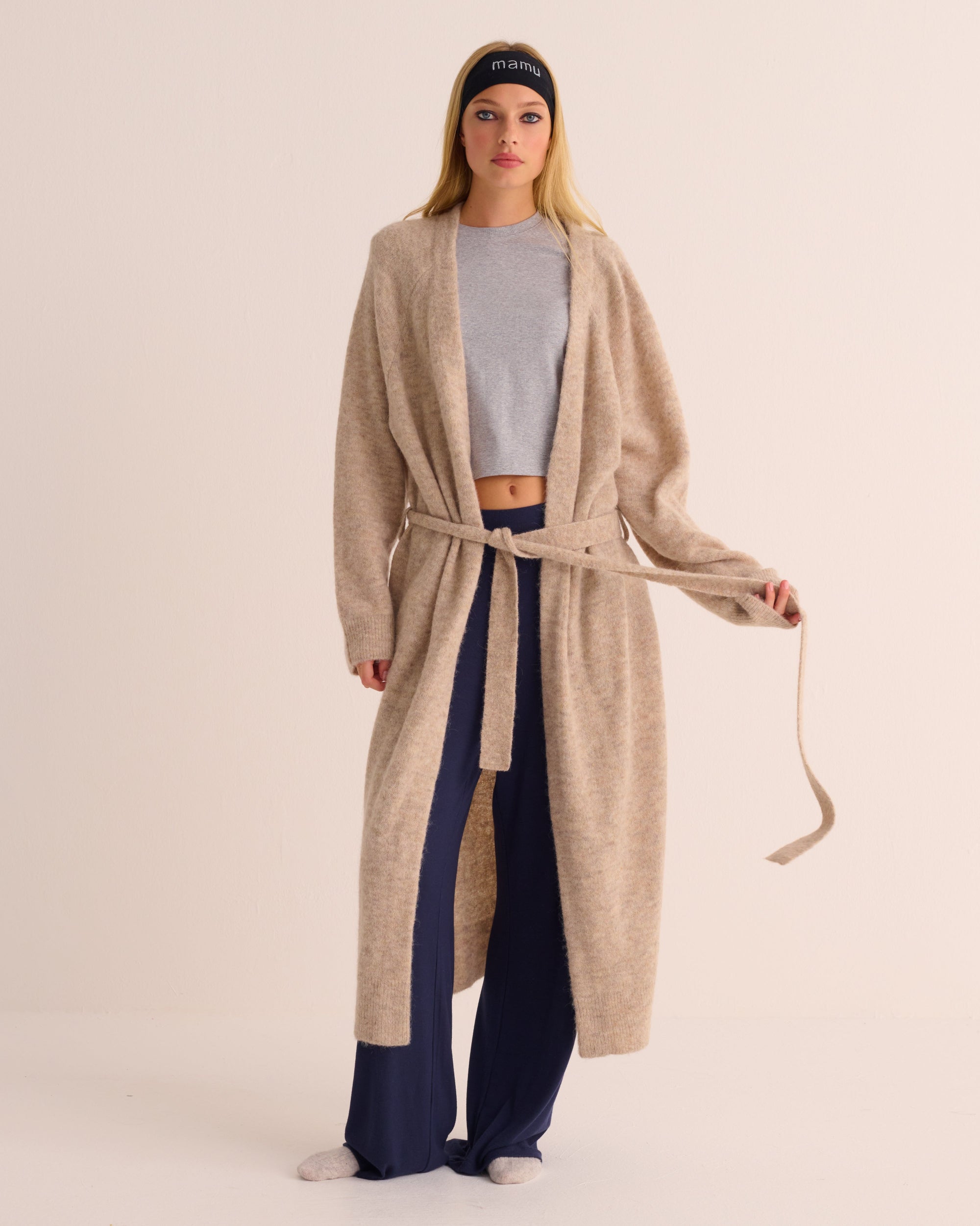 The throw-over you’ll reach for season after season. Spun from a luxuriously soft wool and brushed alpaca blend, this longline layer delivers warmth without the weight. The clean silhouette drapes effortlessly over restwear or daywear, blurring the line between robe, coat and cardigan. Quietly elegant and endlessly versatile, it’s comfort with presence.