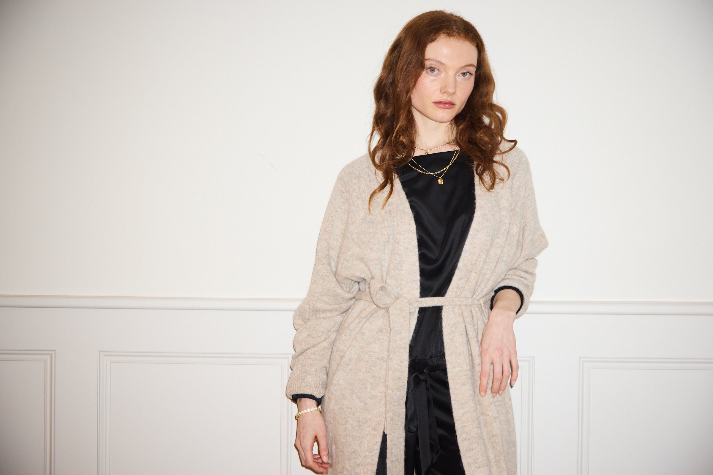 The throw-over you’ll reach for season after season. Spun from a luxuriously soft wool and brushed alpaca blend, this longline layer delivers warmth without the weight. The clean silhouette drapes effortlessly over restwear or daywear, blurring the line between robe, coat and cardigan. Quietly elegant and endlessly versatile, it’s comfort with presence.