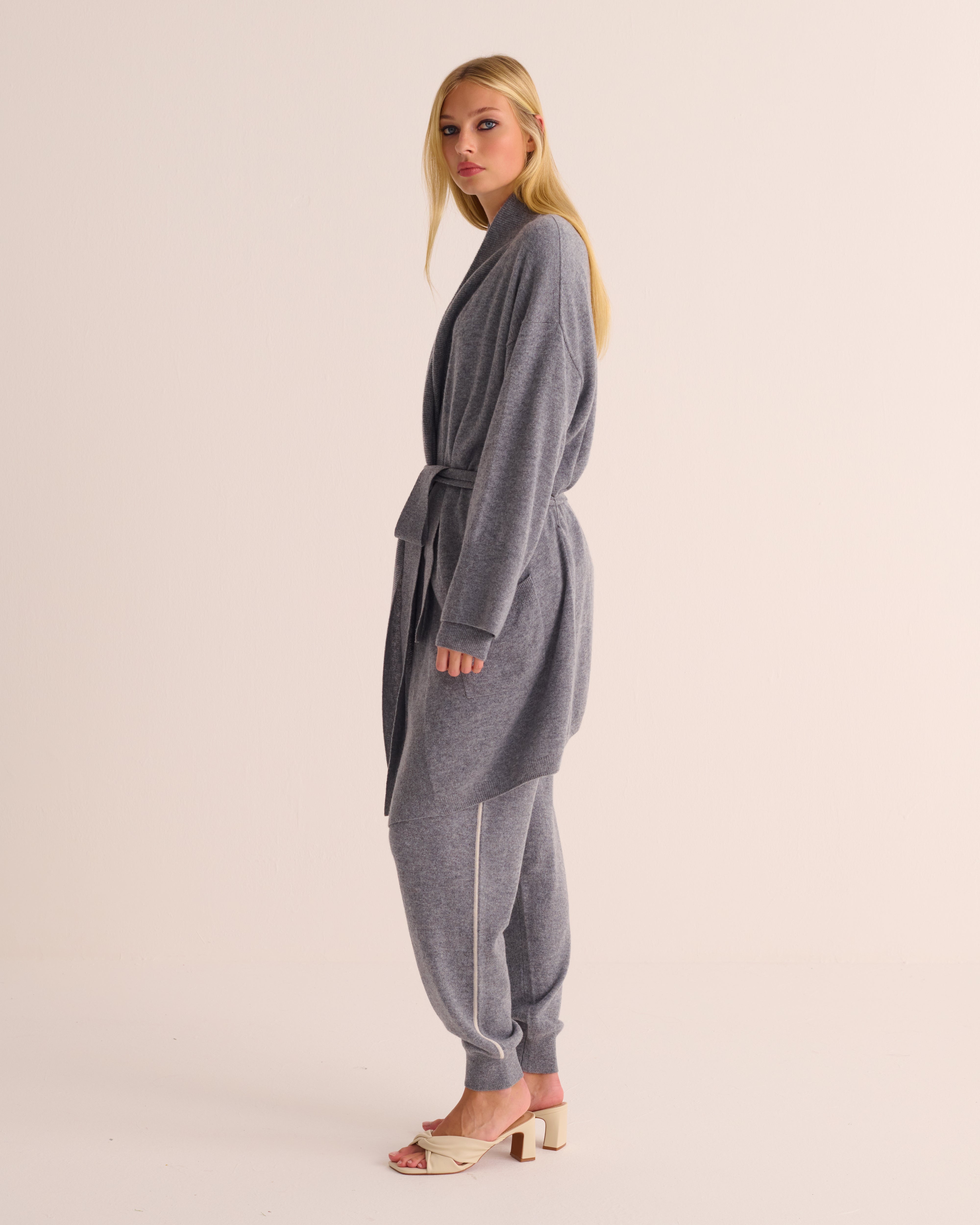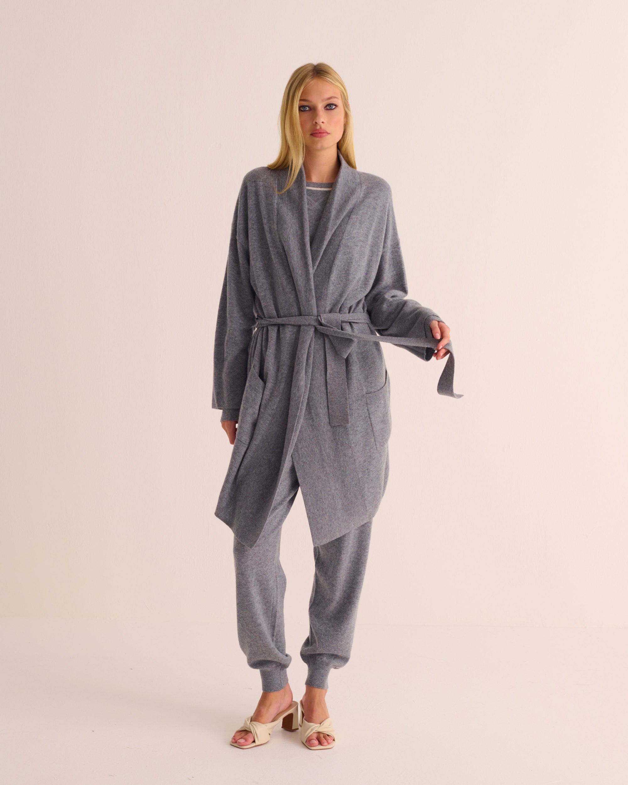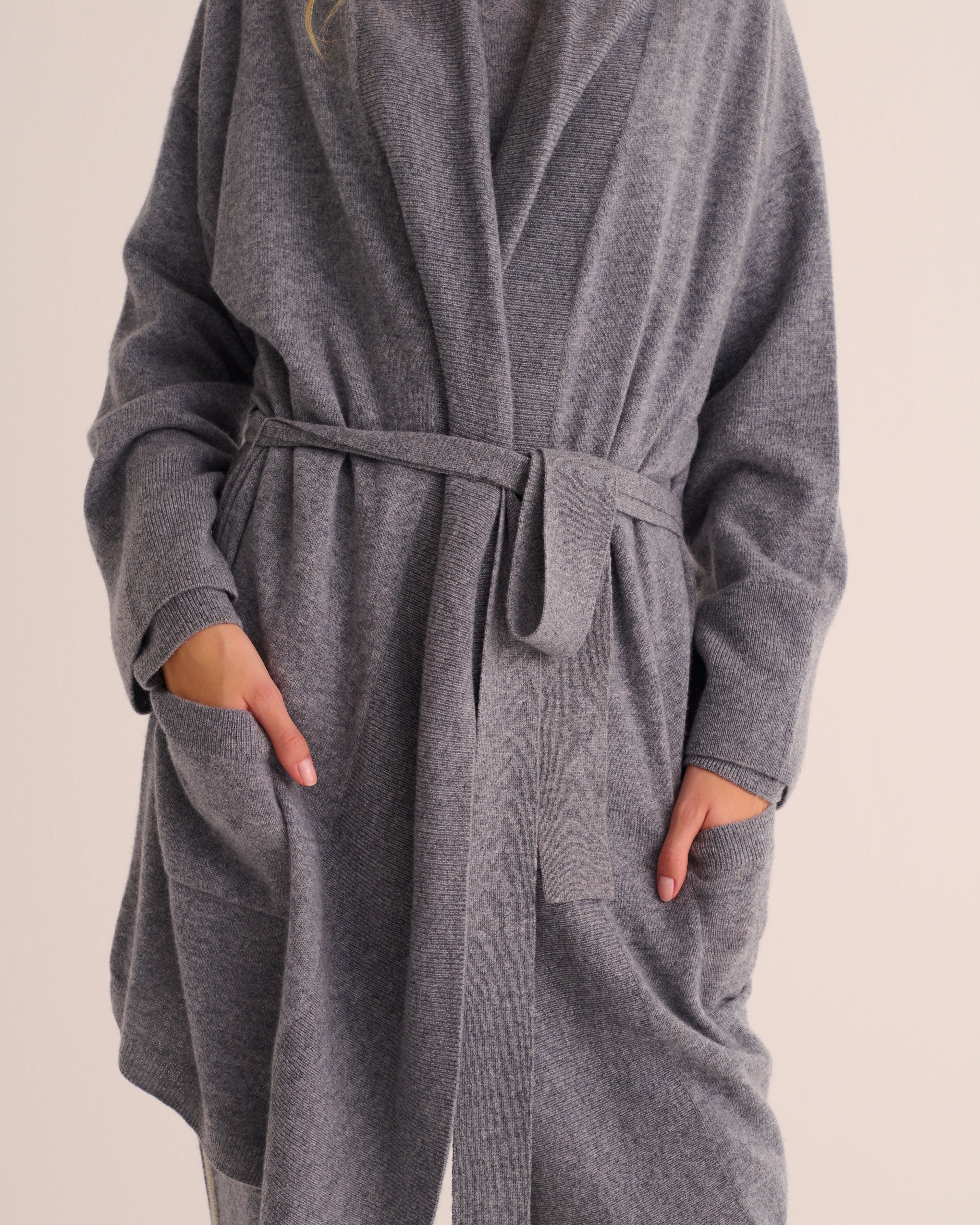 Elevate your everyday. This oversized robe is crafted from 100% cashmere for warmth without the weight. Ribbed detailing and deep pockets bring subtle refinement, while the draped cut, layers beautifully over loungewear or daywear. A statement in quiet luxury that you’ll want to wrap yourself in, from slow mornings to long evenings.