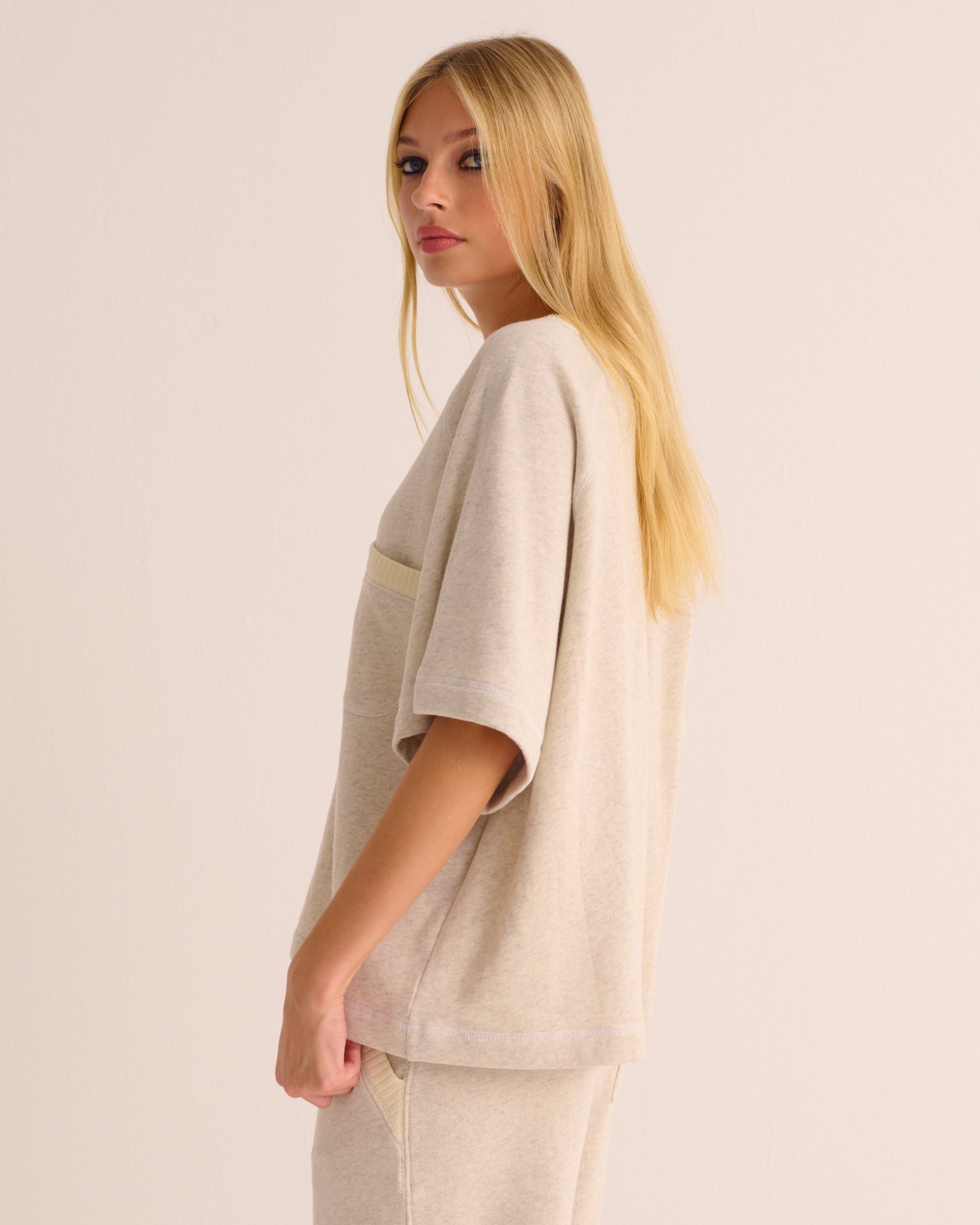 Laid-back luxury in its easiest form. This short sleeve sweatshirt is crafted from our signature Organic Cotton with a rib detailing, feather-light, breathable, and fluid against the skin. The boxy silhouette drapes with ease, while short sleeves keep it modern and versatile, made to layer or stand effortlessly on its own. Finished with a subtle ivory contrast stitching, pocket and a warm latte marl tone, it’s a wardrobe staple that pairs seamlessly with our Mix and Match Separates, denim, or even tailoring.