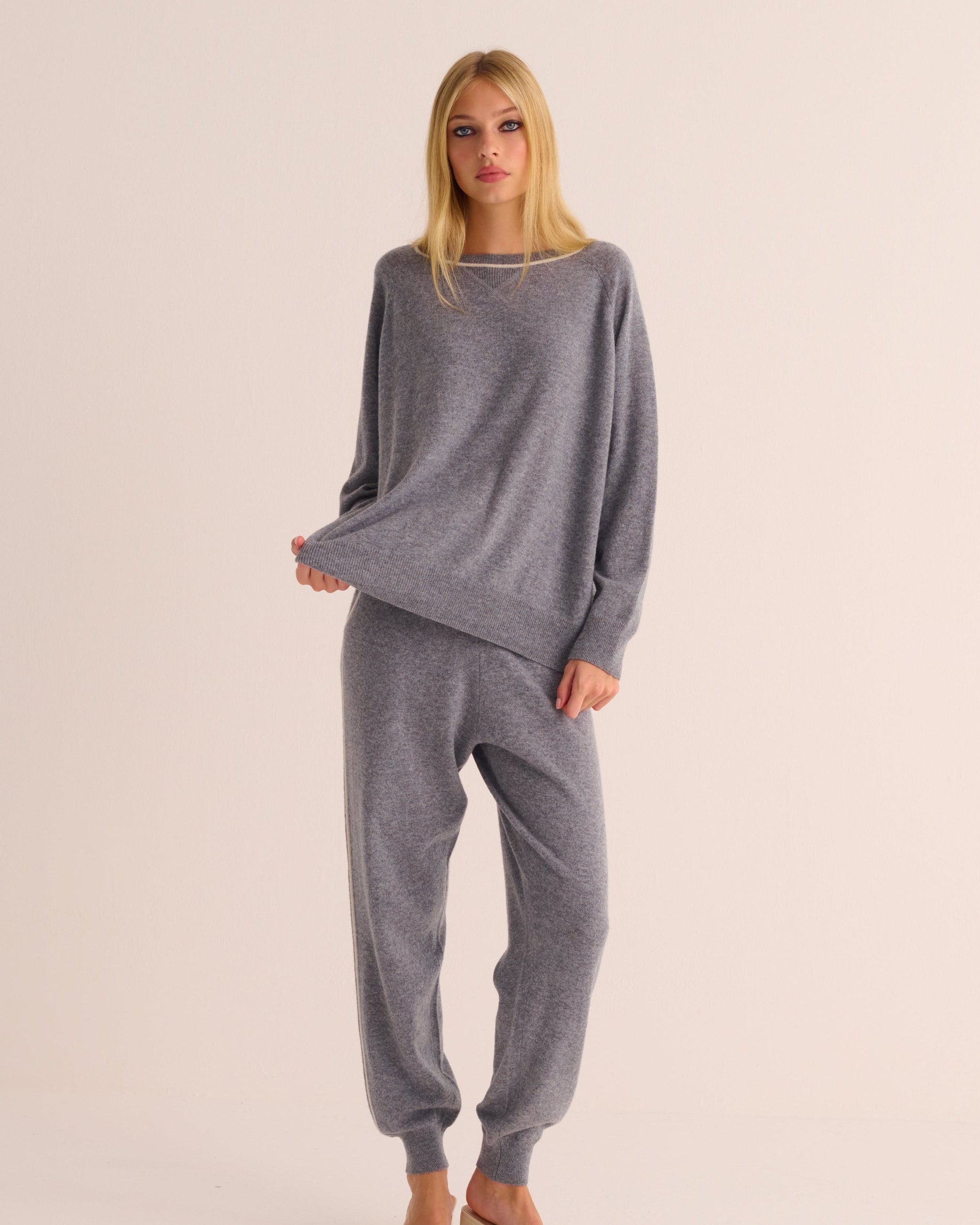 Luxury, in its purest form. Spun from 100% Cashmere, these joggers whisper indulgence with every movement. Air-light yet cocooning, the fluid drape, seamless waistband, ivory piping and cuffed ankle frame the silhouette. Pure silk drawstring tie. Effortless, elevated, and endlessly versatile, pair with our Mix and Match Separates, or team with wardrobe icons for a statement in understated sophistication.